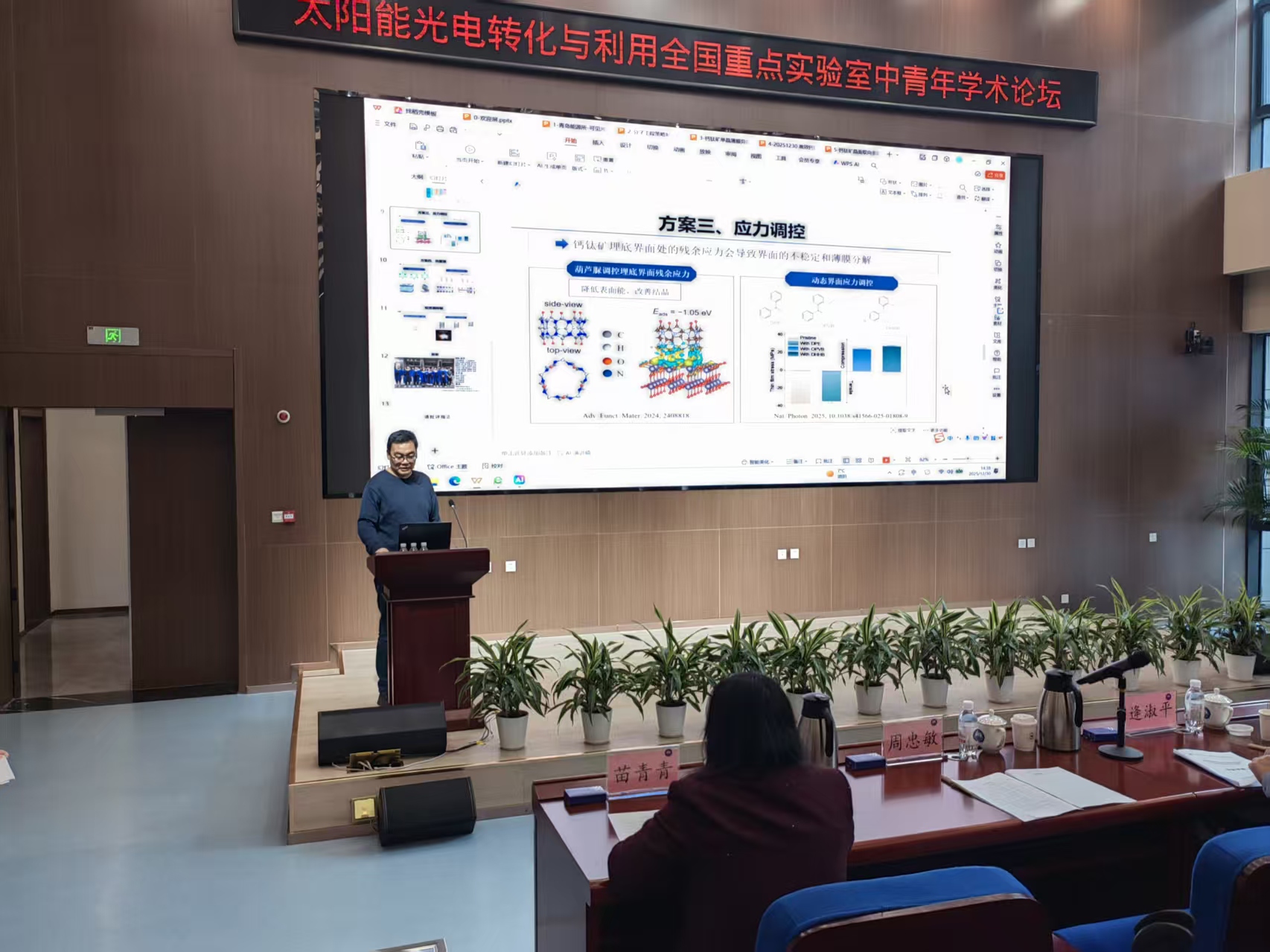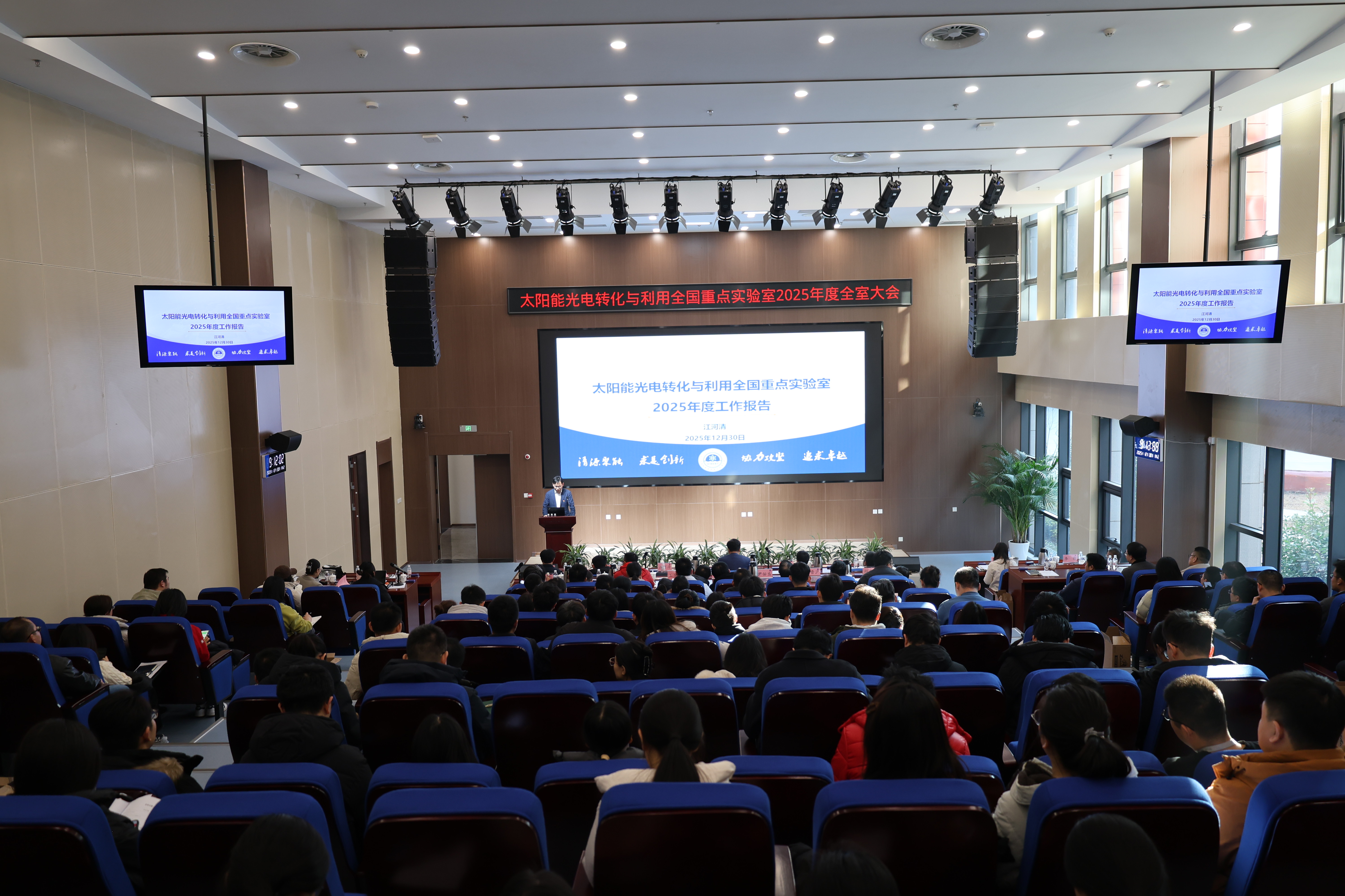 12月30日上午,太阳能光电转化与利用全国重点实验室(以下简称“全重实验室”)2025年度全室大会暨中青年学术论坛在青岛能源所王哥庄园区召开。青岛能源所所长、党委书记吕雪峰,副所长、全重实验室主任江河清,全重实验室副主任郭鑫(大连化物所)、杨栋(大连化物所)、逄淑平、刘健出席会议。逄淑平研究员主持会议。全重实验室全体成员、依托单位管理部门等120余人参加会议。
