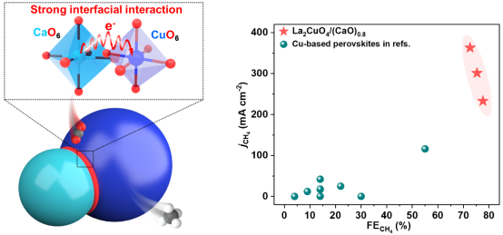 近期,太阳能光电转化与利用全国重点实验室功能膜与氢能技术研究中心膜催化材料研究组在朱佳伟研究员和江河清研究员的指导下,采用自组装策略设计构筑了系列具有可控强相互作用界面的高性能Cu基钙钛矿/氧化钙复合催化剂La2CuO4/(CaO)x。该催化剂中La2CuO4与CaO相通过界面紧密相连,带来了强界面相互作用,主要表现为由Ca2+向Cu2+的电子转移。该系列催化剂对甲烷的活性、选择性与CaO相含量呈火山型趋势(与界面尺寸呈正相关)。具有最大界面的La2CuO4/(CaO)0.8表现出最佳的CH4活性和选择性(在300 mA cm-2时CH4选择性达77.6%),同时具有良好的稳定性,优于已报道的Cu基钙钛矿氧化物。该优异性能主要来源于自组装诱导的强界面相互作用,不仅强化*CO吸附/加氢促进CH4生成,还增强催化剂的抗降解能力提升稳定性。本项工作为设计更先进的Cu基催化剂提供了新的思路,相关研究成果发表于国际著名期刊ACS Nano《美国化学学会-纳米》。