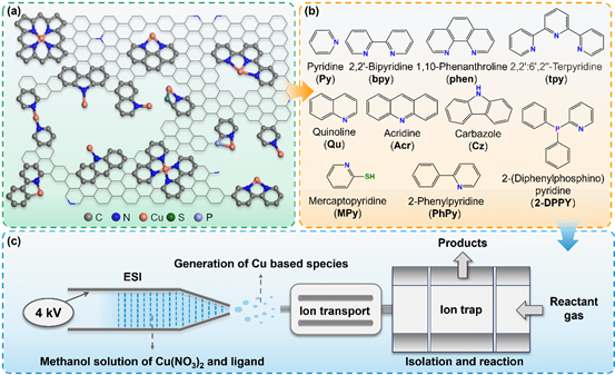 气相团簇模型方法在研究单原子催化剂的构效关系方面具有独特优势。与实际催化体系相比,团簇模型具有原子数精确可控、组成结构明确、电子状态清晰等特点,其构效关系能够通过气相离子-分子反应实验结合高精度量子化学计算实现分子水平的精准解析。M-N-C SACs的活性位点由孤立金属原子及其局域配位环境共同构成,这种配位模式与单金属配合物高度相似。针对不同配位结构碳载单原子构效关系不清的问题,青岛能源所太阳能光电转化与利用全国重点实验团簇化学与能源催化团队联合兰州化物所丁玉晓研究员,提出了“碎片化解耦分析”的策略,即通过构建配位环境明确的气相单金属团簇模型来解耦不同M-N-C SACs活性位点对催化性能的本征贡献。这一方法能够规避实际催化体系中合成方法和表征手段的局限性,利用团队自主改造的线性离子阱质谱,在分子水平上实现了不同配位构型本征活性的精准解析。