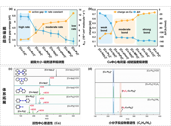 结合上述大量具有明确配位构型的团簇模型的反应特征,研究团队进一步总结出了普适性规律:Cu中心的电荷量可以作为调控Cu-N-C活性位点CO吸附强度的热力学描述符,而Cu-N-C前线轨道能隙作为CO吸附速率的动力学描述符(图3a-b)。此外,该方法也适用于其他探针分子(如N2和C2H4吸附活化等)以及不同金属中心类型(如Co等),实验观察到了与Cu中心吸附CO行为显著不同的现象,验证了该方法的普适性。