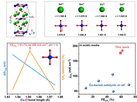 近期,青岛能源所太阳能光电转化与利用全国重点实验功能膜与氢能技术研究中心膜催化材料研究组在朱佳伟研究员和江河清研究员的指导下,发现了一类特殊的A2CuO4铜酸盐材料,为解决上述挑战提供了理想的研究平台。在这类铜酸盐中,每个Cu位点均以平面正方形配位结构与四个等效的O原子成键。通过调节A位离子半径,可以有效地调控这些铜酸盐中的Cu-O键长,而不引入其他影响因素,从而使得厘清Cu-O键长与催化性能间的关系成为可能。