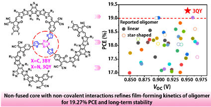 近期,青岛能源所太阳能光电转化与利用全国重点实验室包西昌研究员带领的先进有机功能材料与器件团队在新型多臂寡聚受体的研究中取得重要进展,开发了两类多臂寡聚受体3BY和3QY,并通过调节非稠合核心单元的刚柔度,实现对外围功能臂的构型及聚集态调控,显著提高了OSCs的光伏效率和稳定性。与传统刚性π-稠合核心不同,该研究中采用的非稠合结构赋予材料更高的柔性和适应性,从而减轻了核心单元对寡聚物构型和聚集行为的制约。同时,通过在非稠合中心引入多维非共价键分子内相互作用,实现了对分子间堆积及给受体共混动力学更为精细的优化。最终,以聚合物PM6为给体,基于3QY的光伏电池PCE达到19.27%(权威验证效率18.80%),优于基于3BY器件的性能(17.75%),位列目前已报道的寡聚受体的最高效率。更为重要的是,新型寡聚物的大分子尺寸显著提升了玻璃化转变温度,抑制了电池运行时分子扩散速率,从而增强了光伏器件的稳定性。在80oC连续加热条件下,PM6:3QY光伏电池的T80%寿命(性能衰减到初始效率的80%所需要的时间)超过3000小时。该研究不仅明确了多臂寡聚物受体的结构-性能内在关系,还提出了基于非稠合核心的新型寡聚受体设计策略,为高效且稳定OSCs的研究提供了新思路。