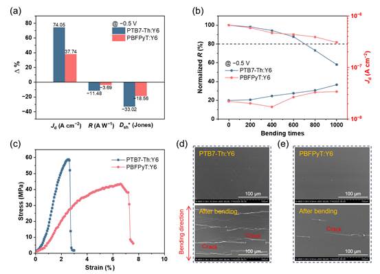 柔性传感器在穿戴智能电子、具身智能、生物医学成像等众多领域具有广阔的应用前景。近年来,基于共轭高分子光敏材料的有机光电探测器(OPDs)具有本征柔性、成本低、功耗低等优点受到广泛关注。但受限于光敏层材料体系的发展,目前柔性OPDs器件仍面临探测性能较低、机械稳定性偏差等问题,限制了其实际应用。